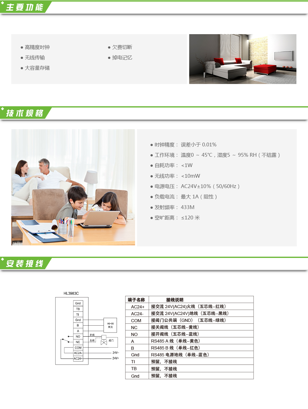 計(jì)量控制器HL3983C是應(yīng)用于集中供熱采暖系統(tǒng)的智能控制器。對(duì)戶內(nèi)采用無線通訊方式與室內(nèi)溫控器進(jìn)行通訊,RS485通訊方式與網(wǎng)關(guān)互聯(lián)??梢跃_計(jì)量閥門開啟時(shí)間,對(duì)室內(nèi)溫度及設(shè)定溫度等參數(shù)精確計(jì)量和存儲(chǔ)?,F(xiàn)場(chǎng)安裝極為簡(jiǎn)單方便。