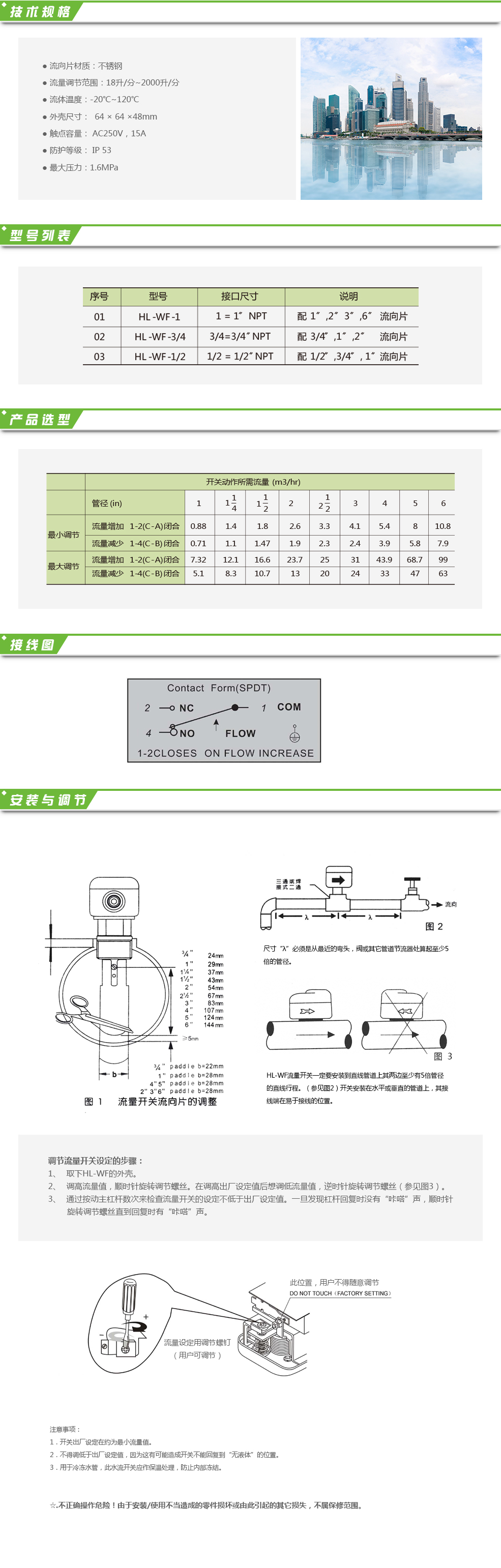 HL-WF系列液體流量開關用于測量流經(jīng)管道的液體流動狀態(tài),例如:水、乙烯、乙二醇或任何對黃銅、不銹鋼無腐蝕作用及未被定為危險液體的流體,其典型應用是使用在需要有連鎖作用或“斷流”保護的場所。