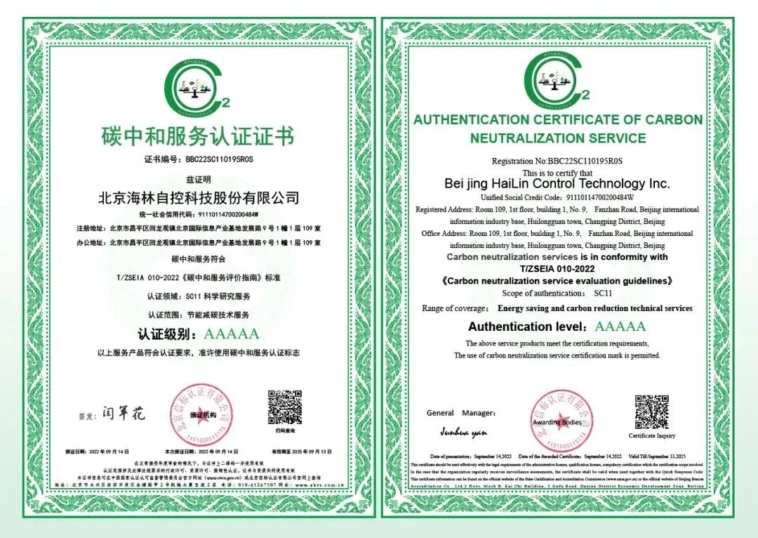 經(jīng)過我司不斷完善、不懈努力,已成功領(lǐng)取“碳中和用戶服務(wù)AAAAA級認(rèn)證證書”,碳中和服務(wù)認(rèn)證分為五個等級,即A、AA、AAA、AAAA、AAAAA級,等級越高說明企業(yè)綜合實力和服務(wù)水平越高。此次評審,海林自控榮獲最高級別碳中和服務(wù)認(rèn)證。