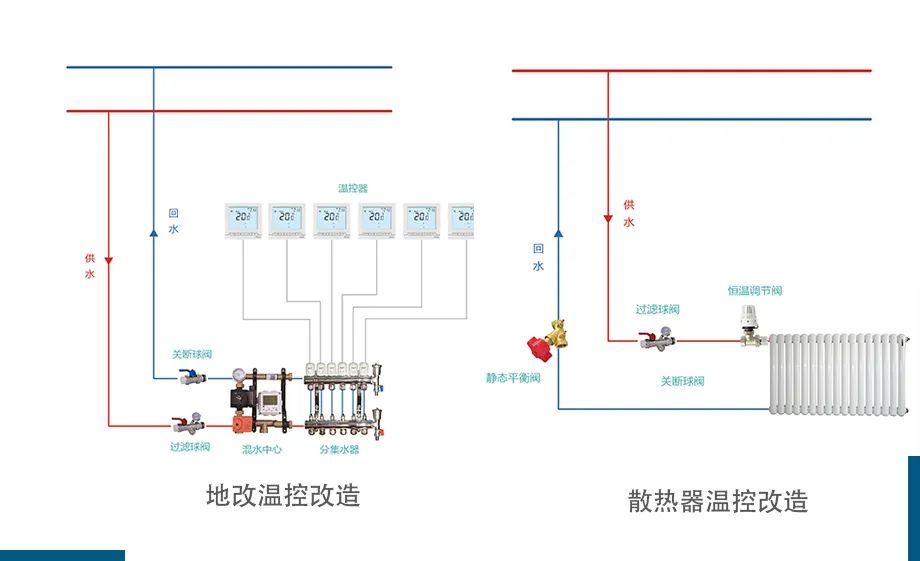 地暖溫控改造:在分室采暖控溫系統(tǒng)方案上,加裝混水控制中心,將高溫水混合降溫,延長(zhǎng)地暖管材使用壽命,改變?cè)瓉?lái)的供熱不均、供熱質(zhì)量差的情況,實(shí)現(xiàn)房間內(nèi)恒溫,提升居住舒適度。