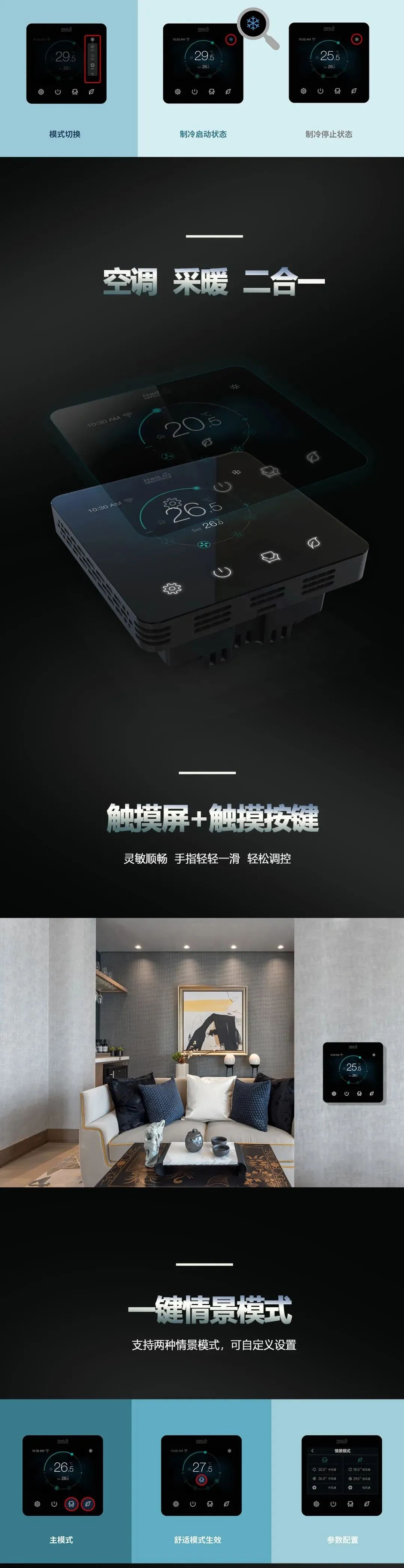 人性化的UI界面以及簡(jiǎn)單的操作方式,給您帶來(lái)全新的使用體驗(yàn),實(shí)現(xiàn)室內(nèi)舒適、健康、節(jié)能與智能控制。