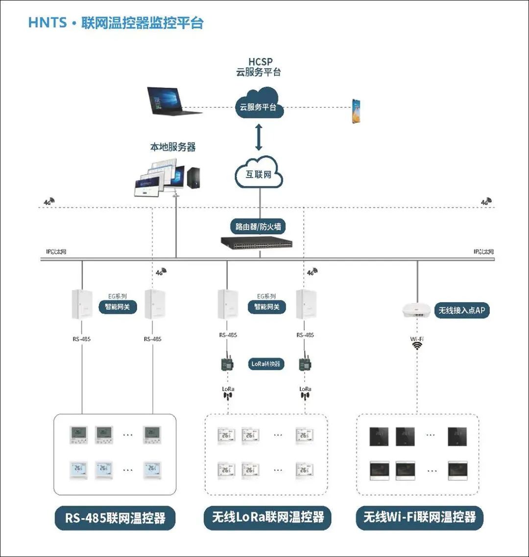 海林HNTS末端溫控器集控系統(tǒng)集自動(dòng)化控制技術(shù)、計(jì)算機(jī)網(wǎng)絡(luò)技術(shù)于一體,可同時(shí)集中或獨(dú)立對(duì)多臺(tái)末端設(shè)備的啟停、水閥的開(kāi)閉及溫度設(shè)置進(jìn)行控制。有三種聯(lián)網(wǎng)集控方式:RS-485 有線方式、 LoRa 無(wú)線方式和 Wi-Fi 無(wú)線方式。