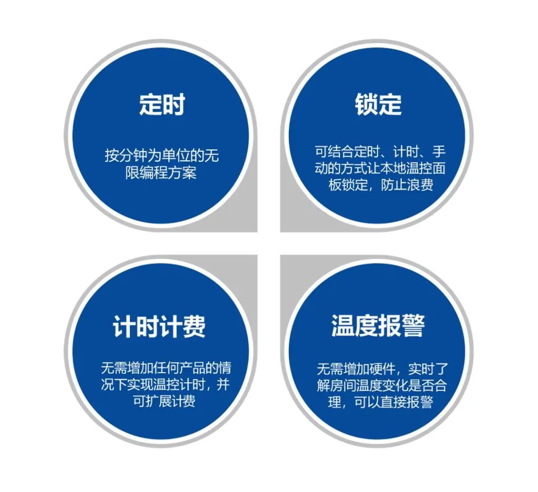 此外,HNTS末端溫控器集控系統(tǒng)集定時(shí)、計(jì)時(shí)計(jì)費(fèi)、鎖定、溫度變化監(jiān)測(cè)于一體,實(shí)現(xiàn)嚴(yán)格控溫,保證室內(nèi)環(huán)境的舒適健康。
