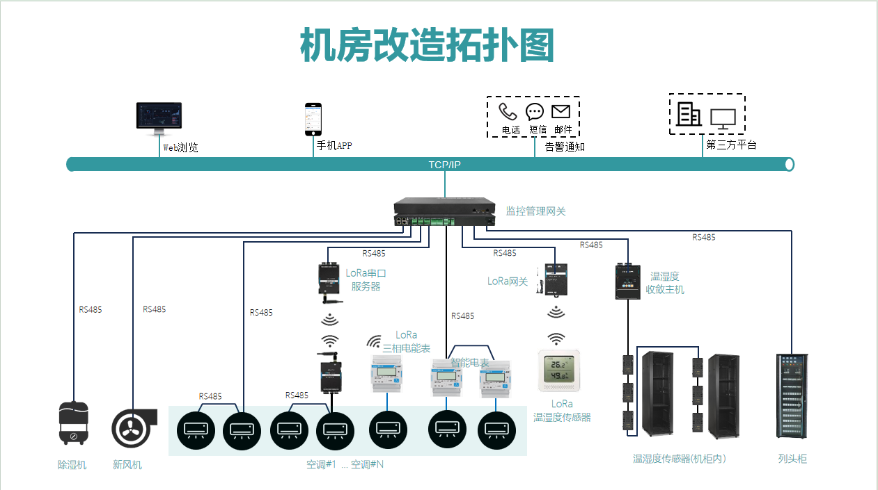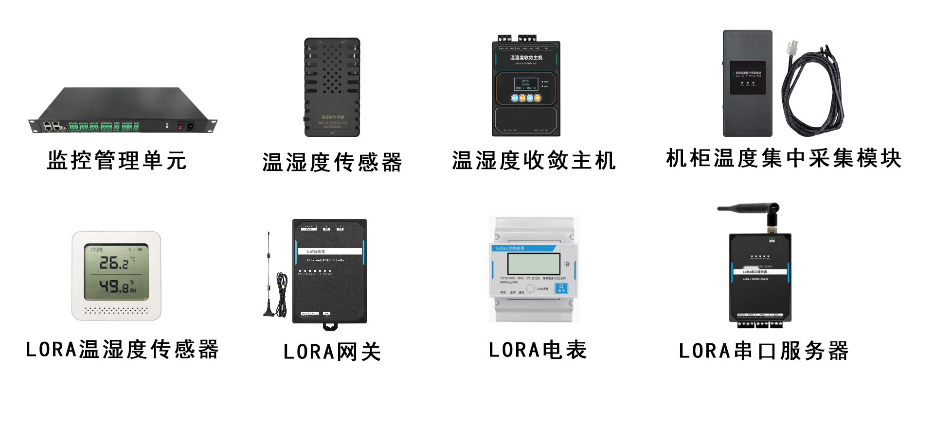 該系統(tǒng)設(shè)備由:監(jiān)控管理單元、溫濕度傳感器/收斂主機(jī)、機(jī)柜溫度集中采集模塊、LORA傳感器/網(wǎng)關(guān)/電表/串口服務(wù)器組成