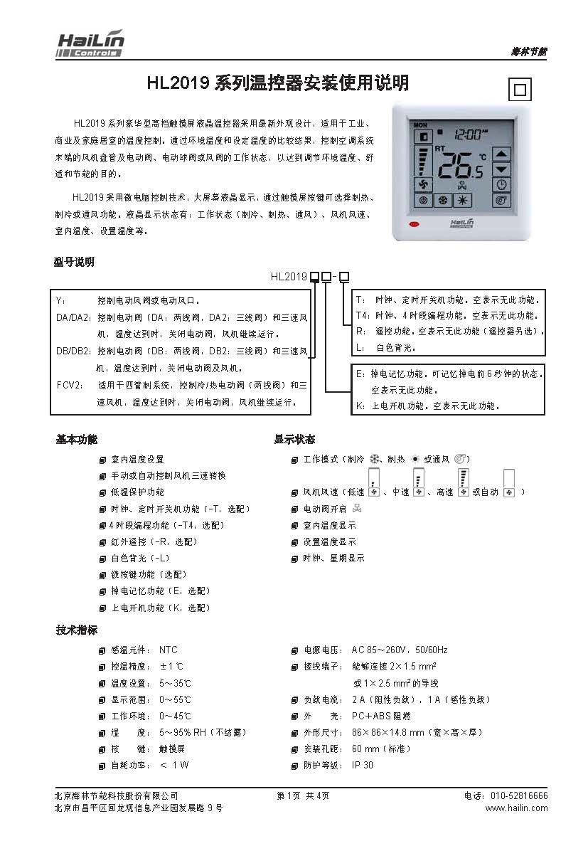 HL2019系列豪華型高檔觸摸屏液晶溫控器采用最新外觀設計,適用于工業(yè)、商業(yè)及家庭居室的溫度控制。通過環(huán)境溫度和設定溫度的比較結果,控制空調系統(tǒng)末端的風機盤管及電動閥、電動球閥或風閥的工作狀態(tài),以達到調節(jié)環(huán)境溫度、舒適和節(jié)能的目的。