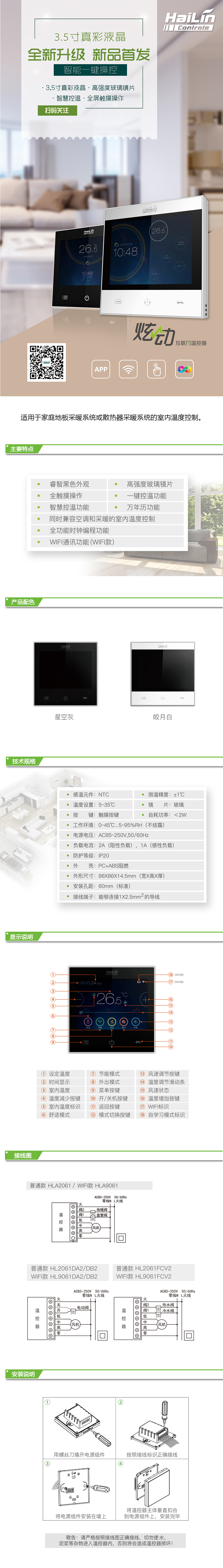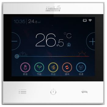 適用于中央空調風機盤管系統(tǒng)或風管道系統(tǒng),自動調節(jié)室內溫度。炫麗3.5寸真彩液晶屏,全屏觸摸操作,星空灰、皎月白兩種顏色可選,外觀設計簡約、時尚,表達了最直觀的美。智慧控溫,一鍵操作,具有自學習功能,將智能科技融入舒適生活。