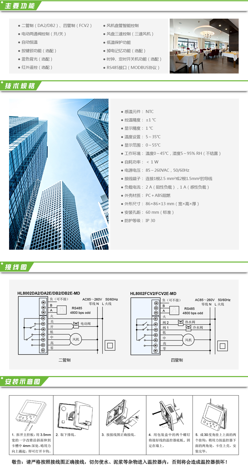 網(wǎng)絡(luò)溫控器HL8002-MD適用于中央空調(diào)風(fēng)機盤管系統(tǒng)或風(fēng)管道系統(tǒng)的室內(nèi)溫度控制,通過室內(nèi)溫度和設(shè)定溫度相比較,對空調(diào)系統(tǒng)末端的風(fēng)機盤管、電動閥或電動球閥進行開啟和關(guān)閉控制達(dá)到調(diào)節(jié)室內(nèi)溫度、舒適及節(jié)能的目的,可通過網(wǎng)絡(luò)(MODBUS協(xié)議)控制溫控器的工作。