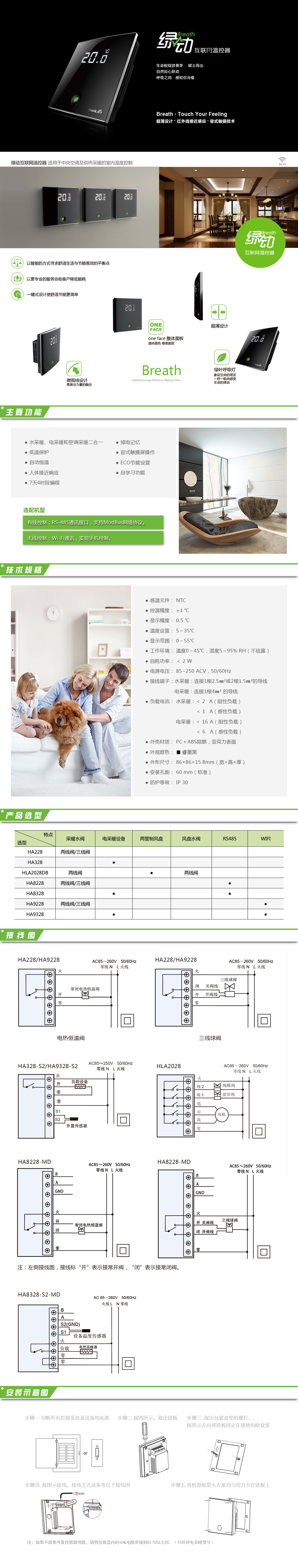 綠動(dòng)采暖溫控器包括“本地控制、有線控制、無線控制”三種類型,適用于家庭地板采暖系統(tǒng)或散熱器采暖系統(tǒng)的室內(nèi)溫度控制。微弧線曲面設(shè)計(jì)彰顯柔美與力量融合。面板整體睿墨含蓄尊貴雅致。綠葉呼吸燈時(shí)尚點(diǎn)綴,如呼吸間感受生命律動(dòng)象征生命萌發(fā)。