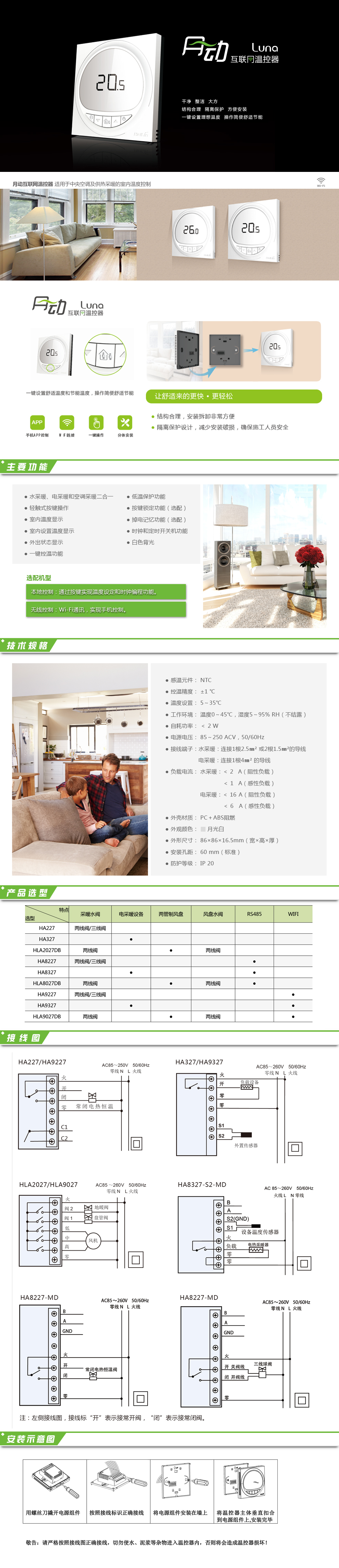 月動(dòng)采暖溫控器包括“本地控制、有線控制、無線控制”三種類型,適用于家庭地板采暖系統(tǒng)或散熱器采暖系統(tǒng)的室內(nèi)溫度控制。外觀干凈整潔大方,結(jié)構(gòu)合理極易拆裝。人性化隔離保護(hù)設(shè)計(jì)防止安裝破損,保證施工人員安全。采暖型產(chǎn)品一鍵設(shè)置舒適溫度和節(jié)能溫度,極大方便用戶的操作使用。