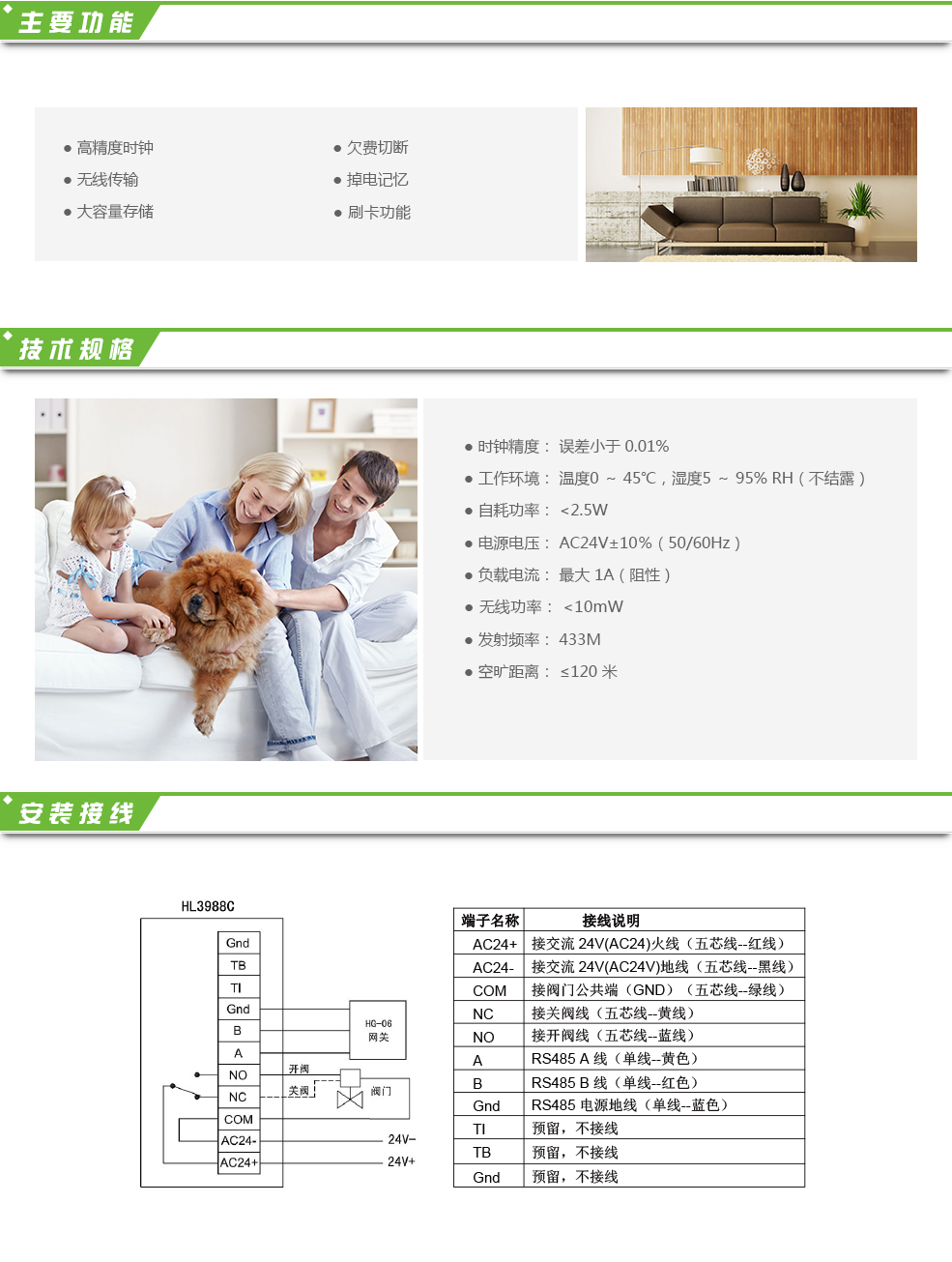 刷卡計(jì)量控制器HL3988C是應(yīng)用于集中供熱采暖系統(tǒng)的智能控制器。對(duì)戶內(nèi)采用無線通訊方式與室內(nèi)溫控器進(jìn)行通訊,RS485通訊方式與網(wǎng)關(guān)互聯(lián)??梢跃_計(jì)量閥門開啟時(shí)間,對(duì)室內(nèi)溫度及設(shè)定溫度等參數(shù)精確計(jì)量和存儲(chǔ)?,F(xiàn)場(chǎng)安裝極為簡(jiǎn)單方便。